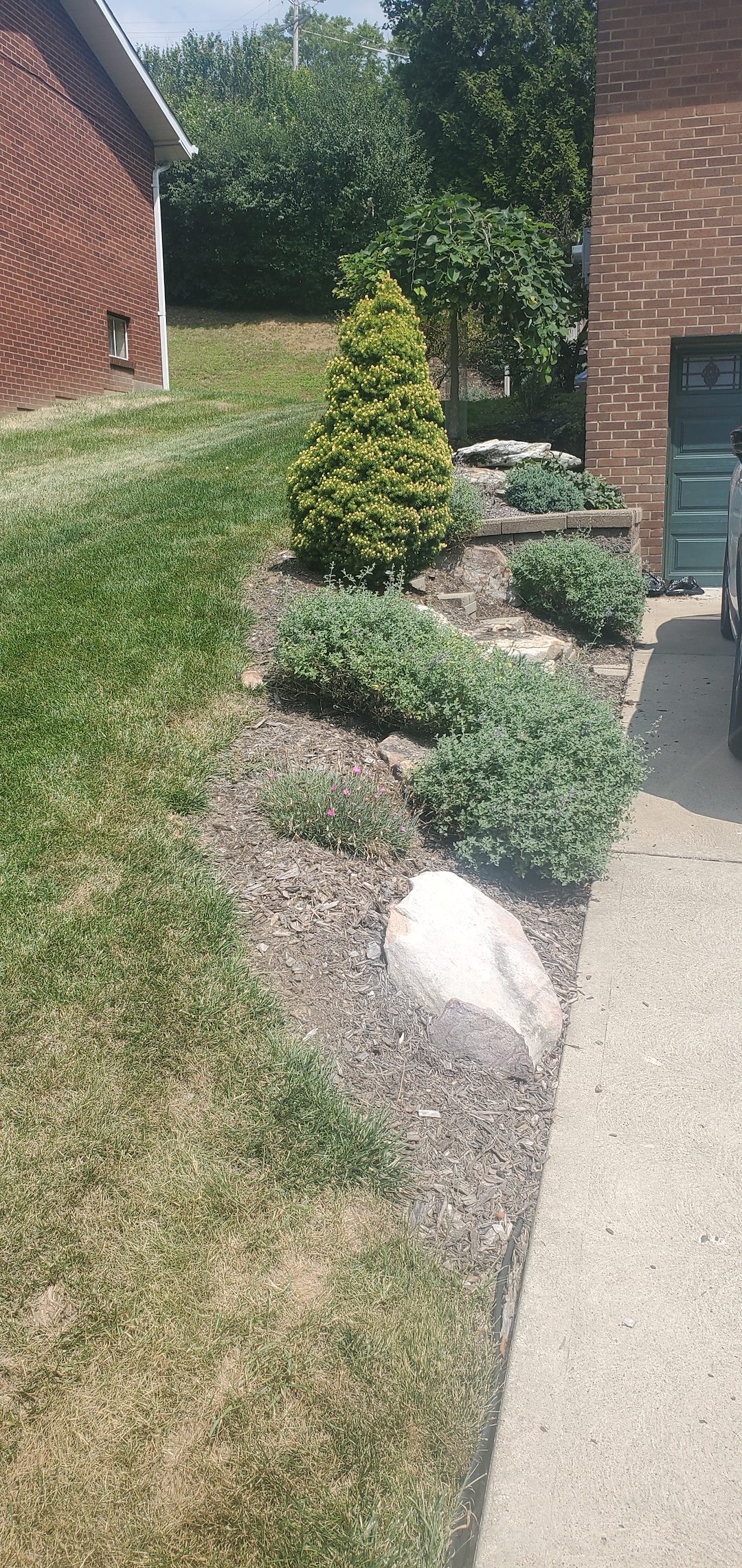 We also added additional plants on the hillside. These new plantings filled bare spots and complemented the existing landscape layout. Installing plants on the slope required careful placement to maintain visual balance and coverage.